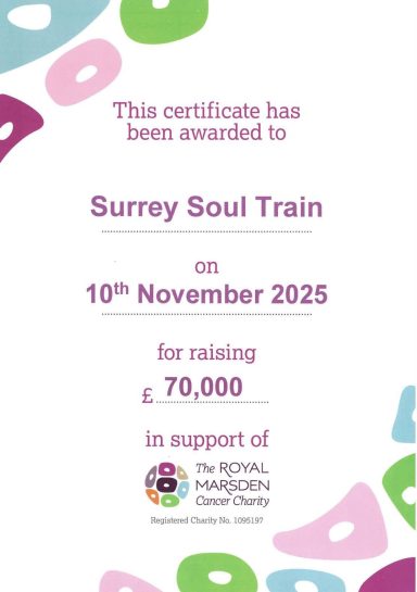 We at the Surrey Soul Train continue to raise much needed funds for the Royal Marsden Cancer Charity & so far we have raised over £70k for this charity alone!